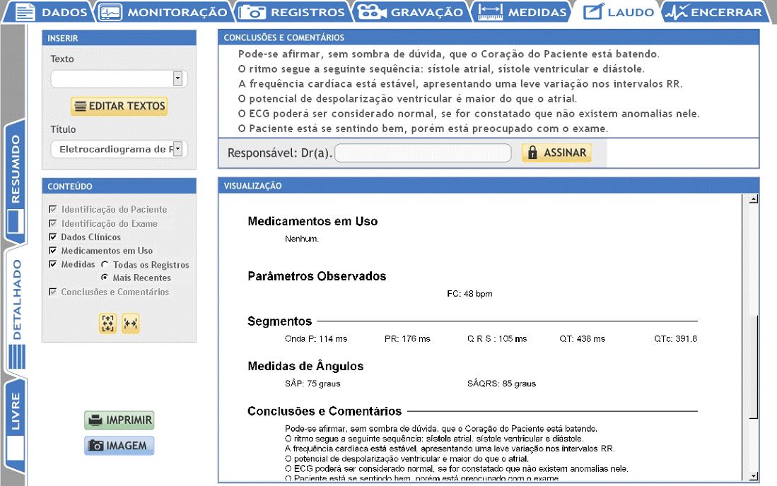 Laudo Resumido: resumi em apenas uma folha o registro impresso de um exame mais comum. Nela aparecerão informações como nome do paciente, nome da instituição, traçado das diversas derivações, texto do laudo e informações para a rastreabilidade do registro.